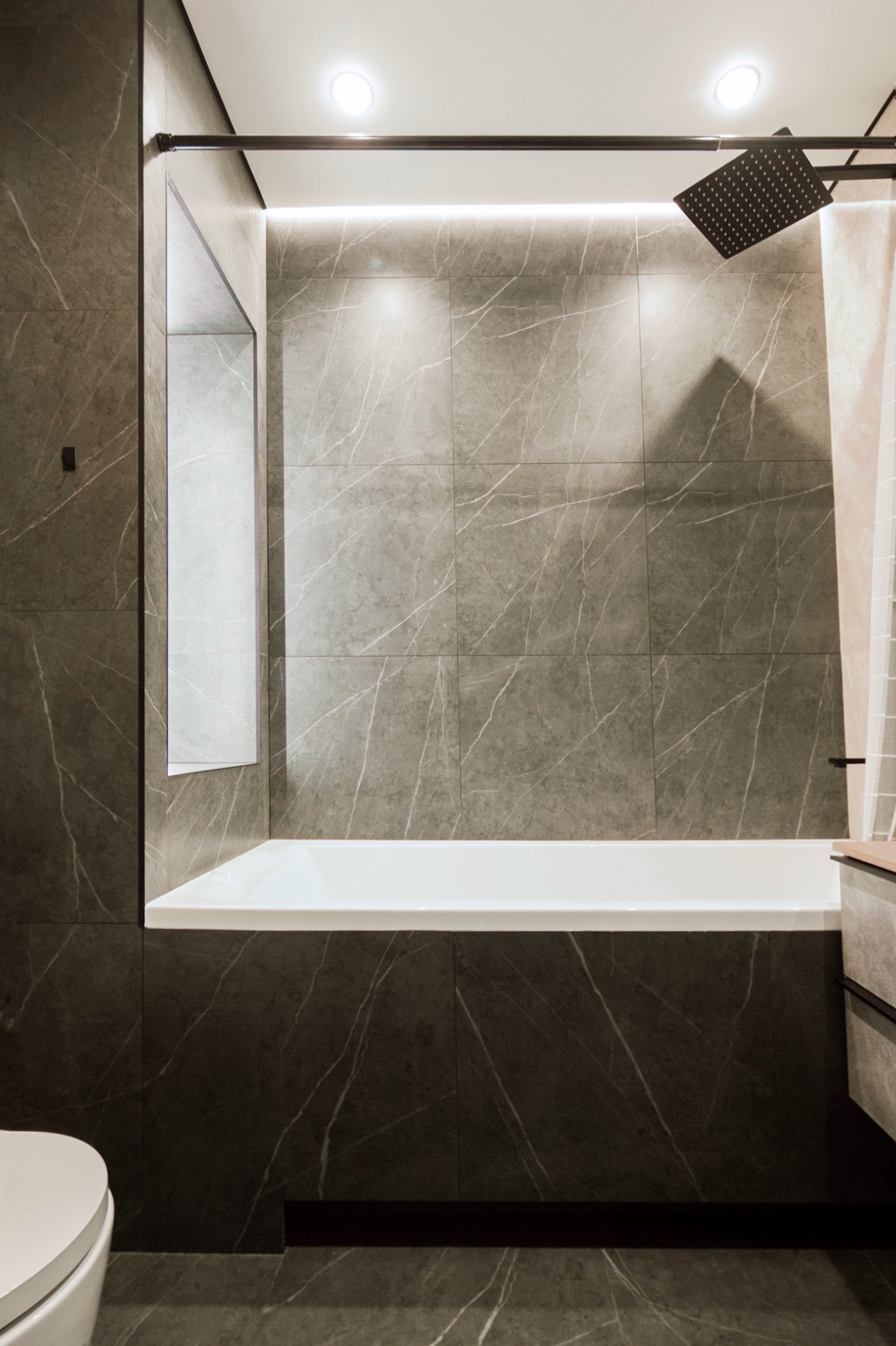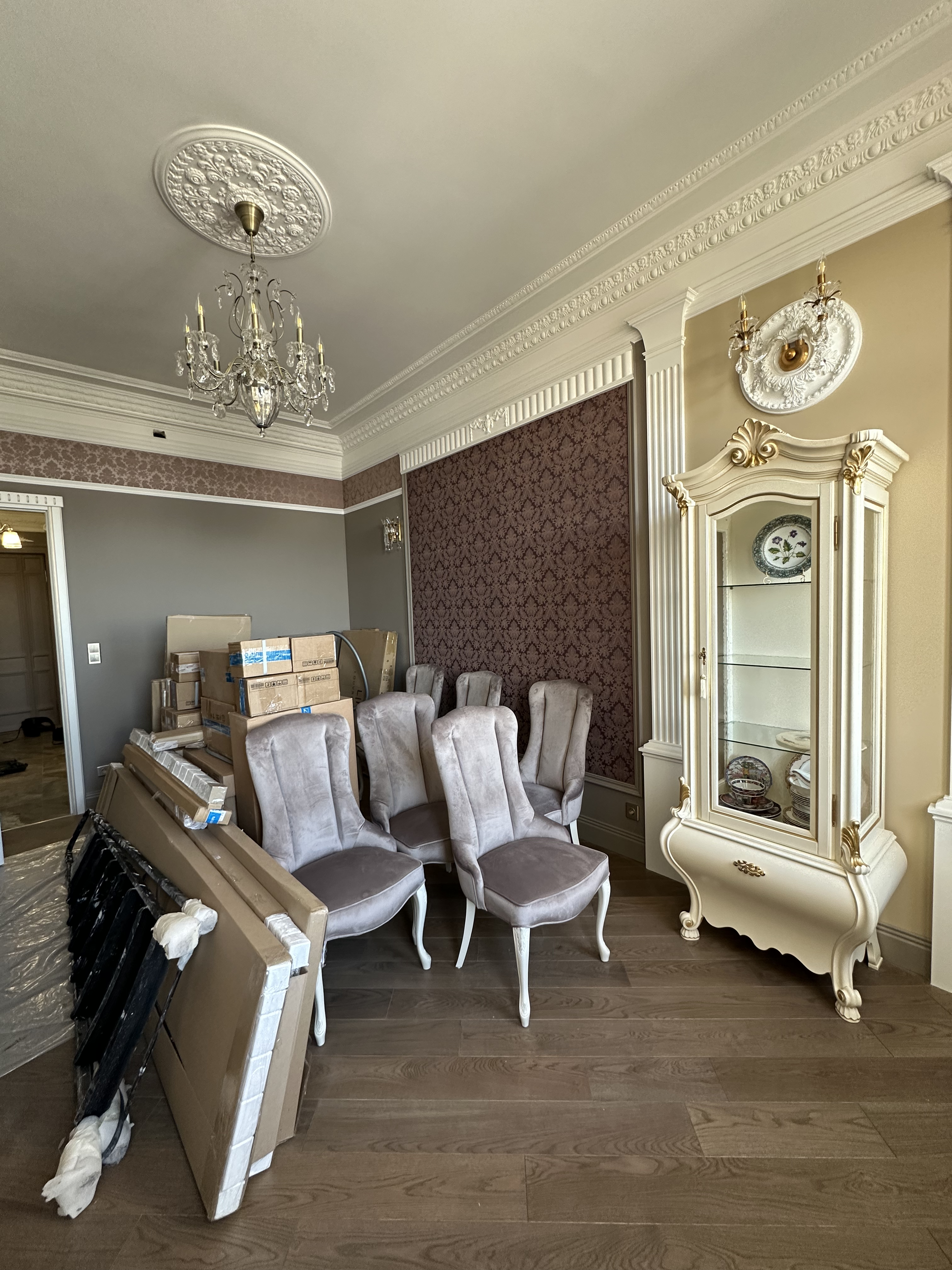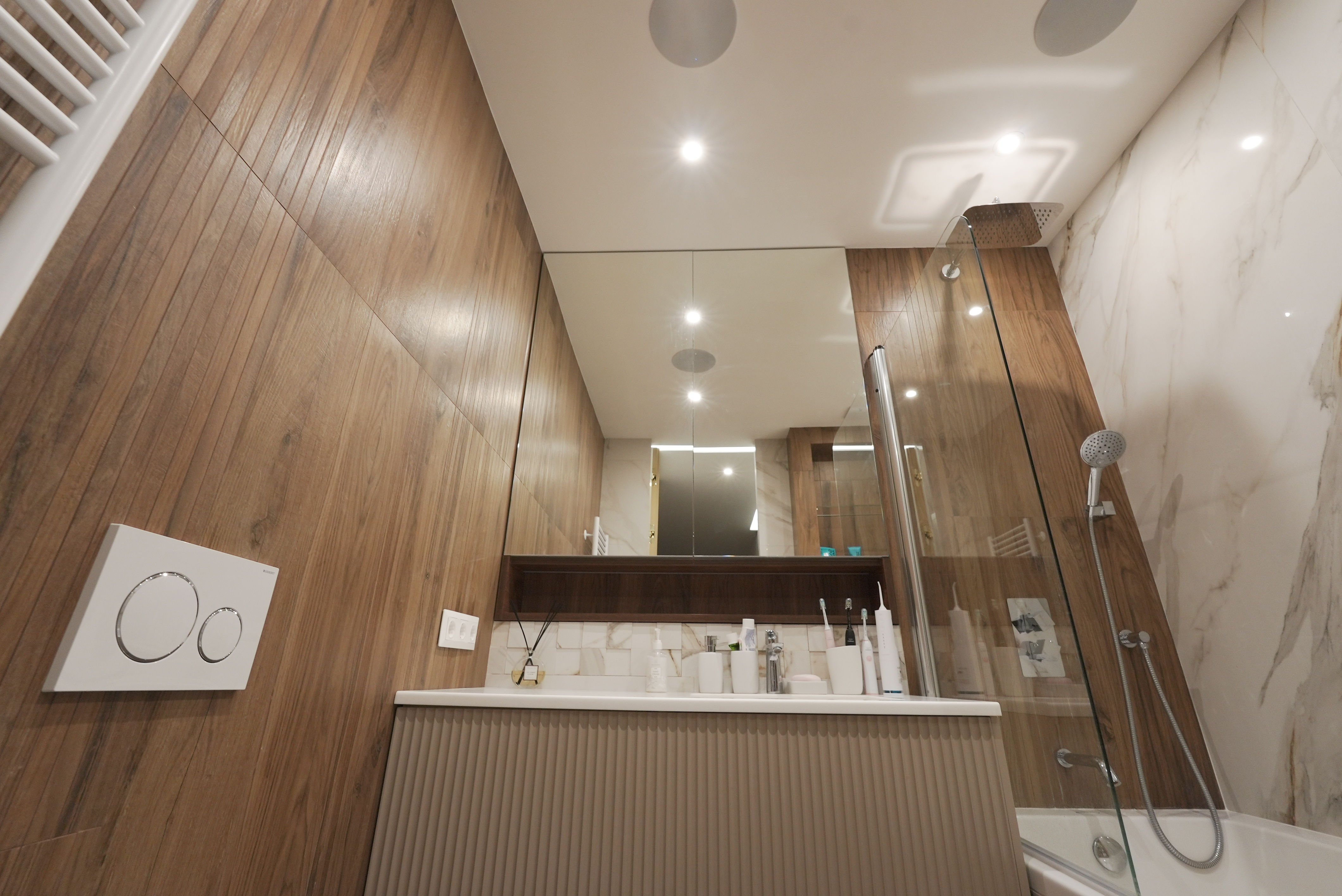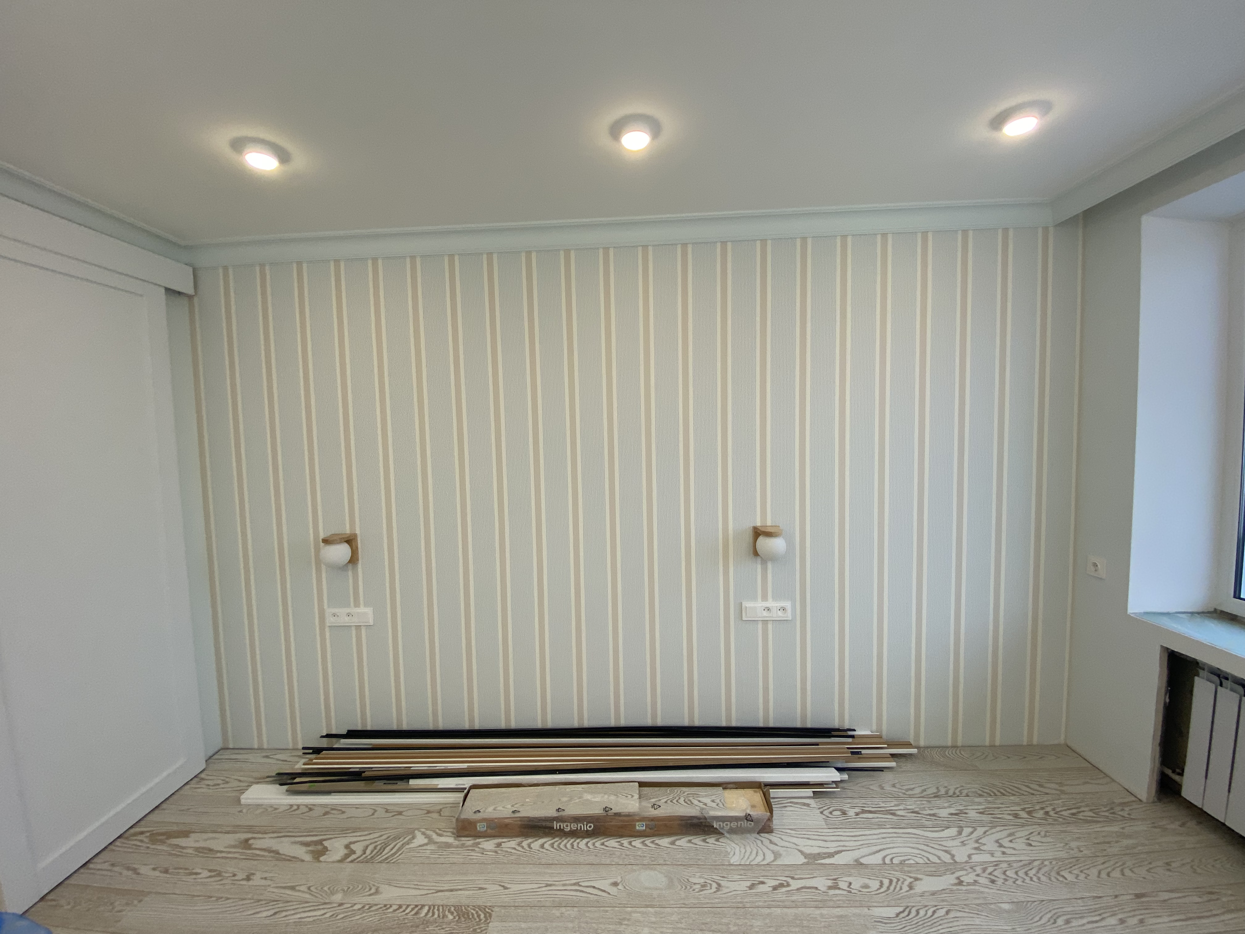 - Чистовая отделка: укладка керамогранита на пол и стены, шпаклевка стен и потолка под окраску, заливка наливного пола, укладка инженерной доски, окраска стен и потолка, установка розеток, выключателей и светильников.