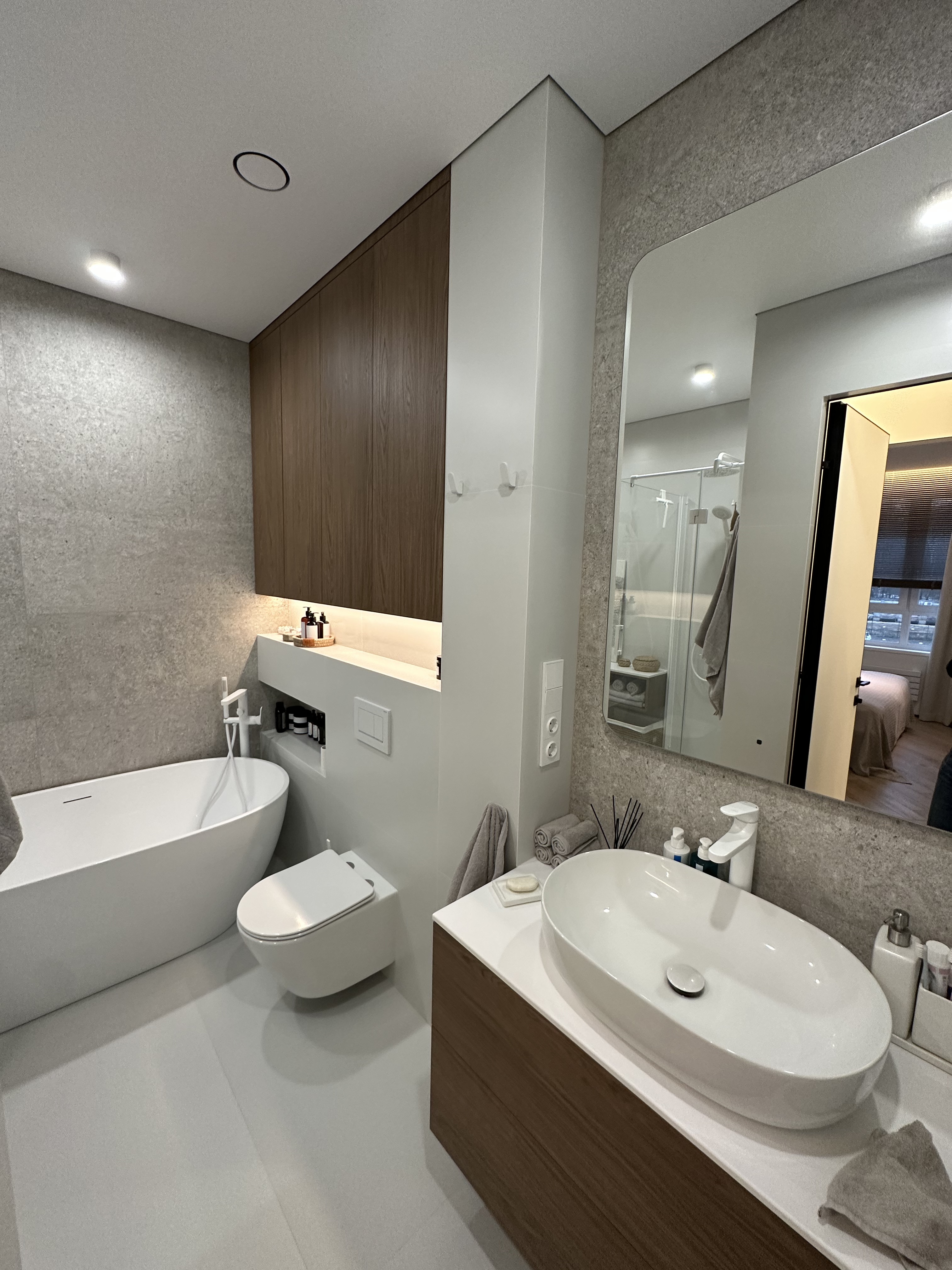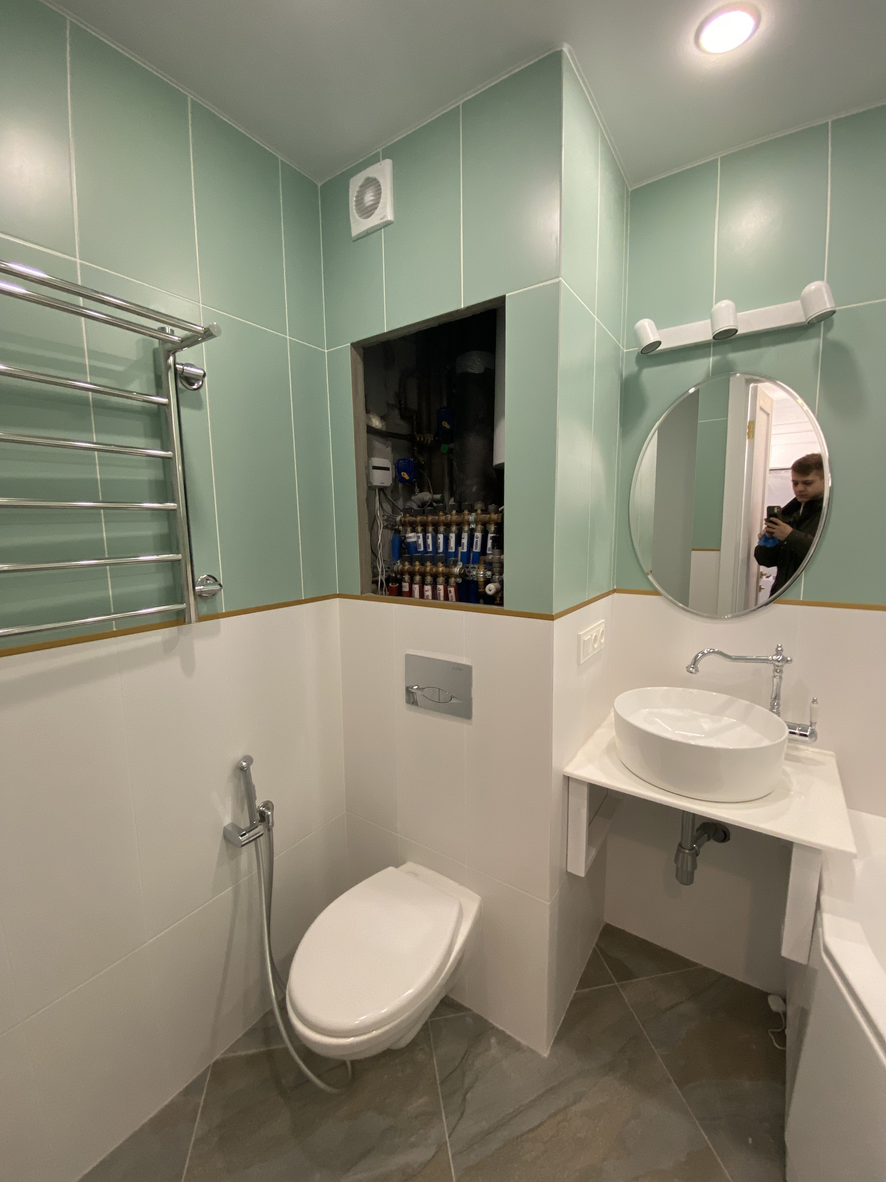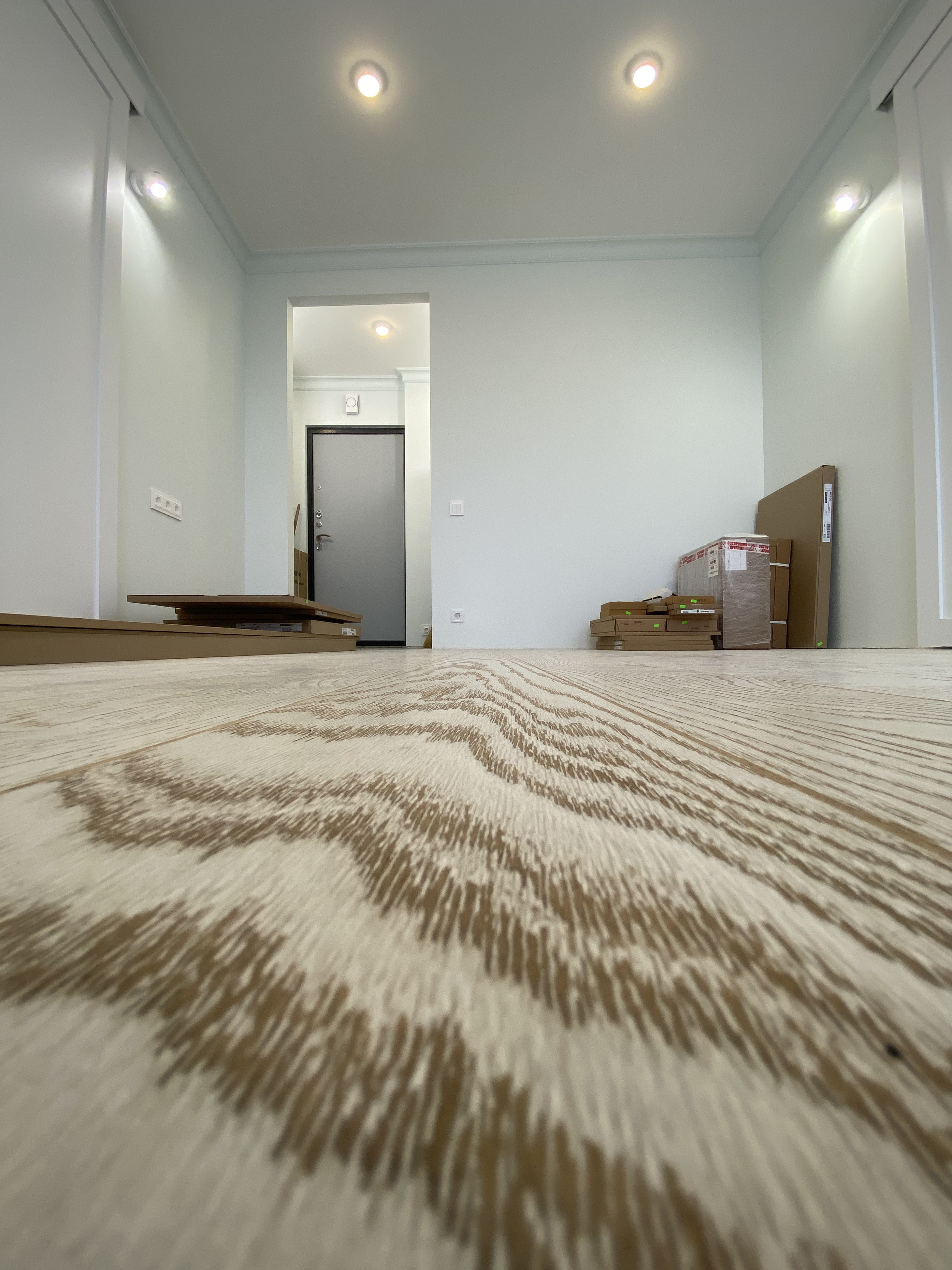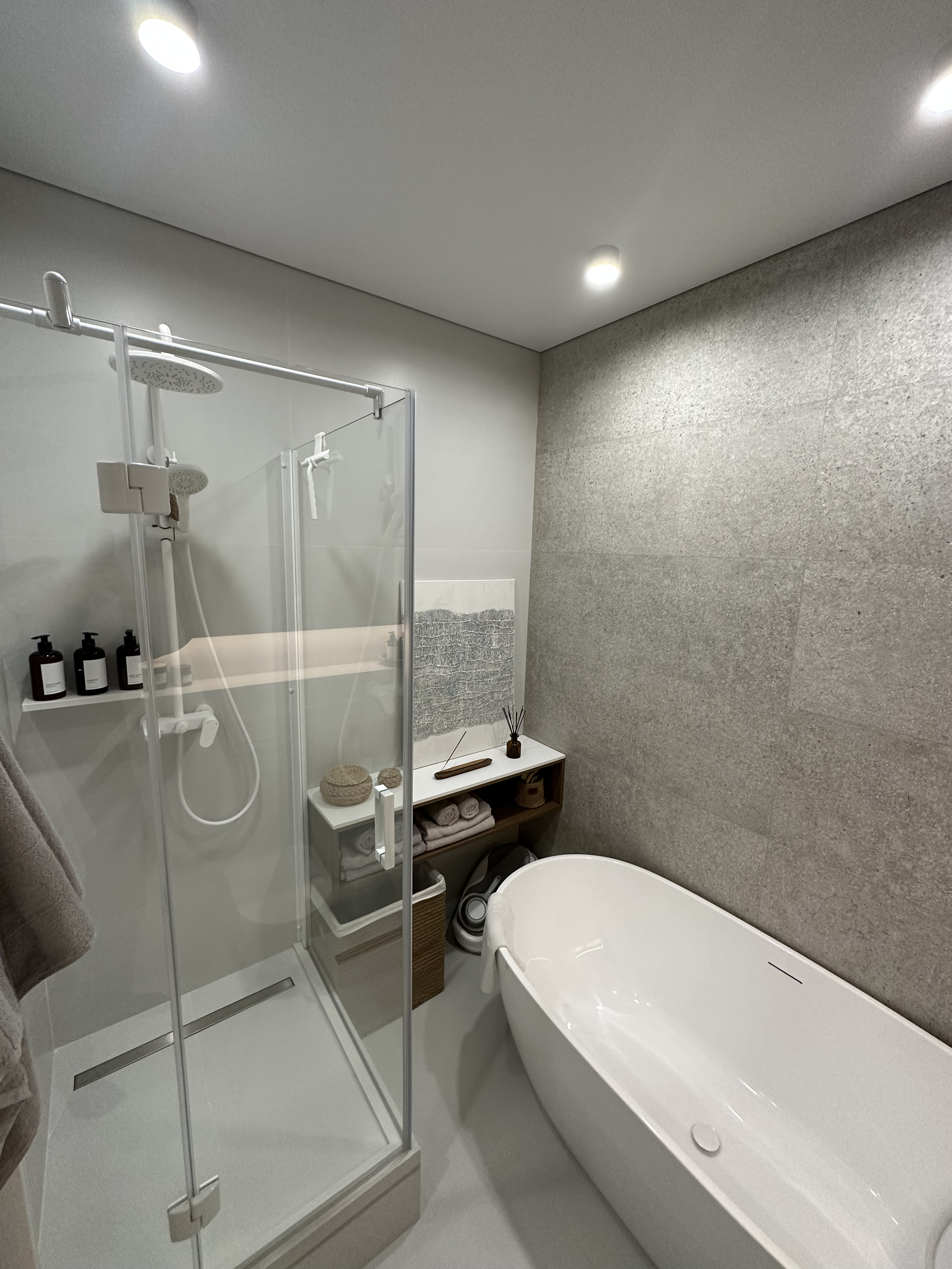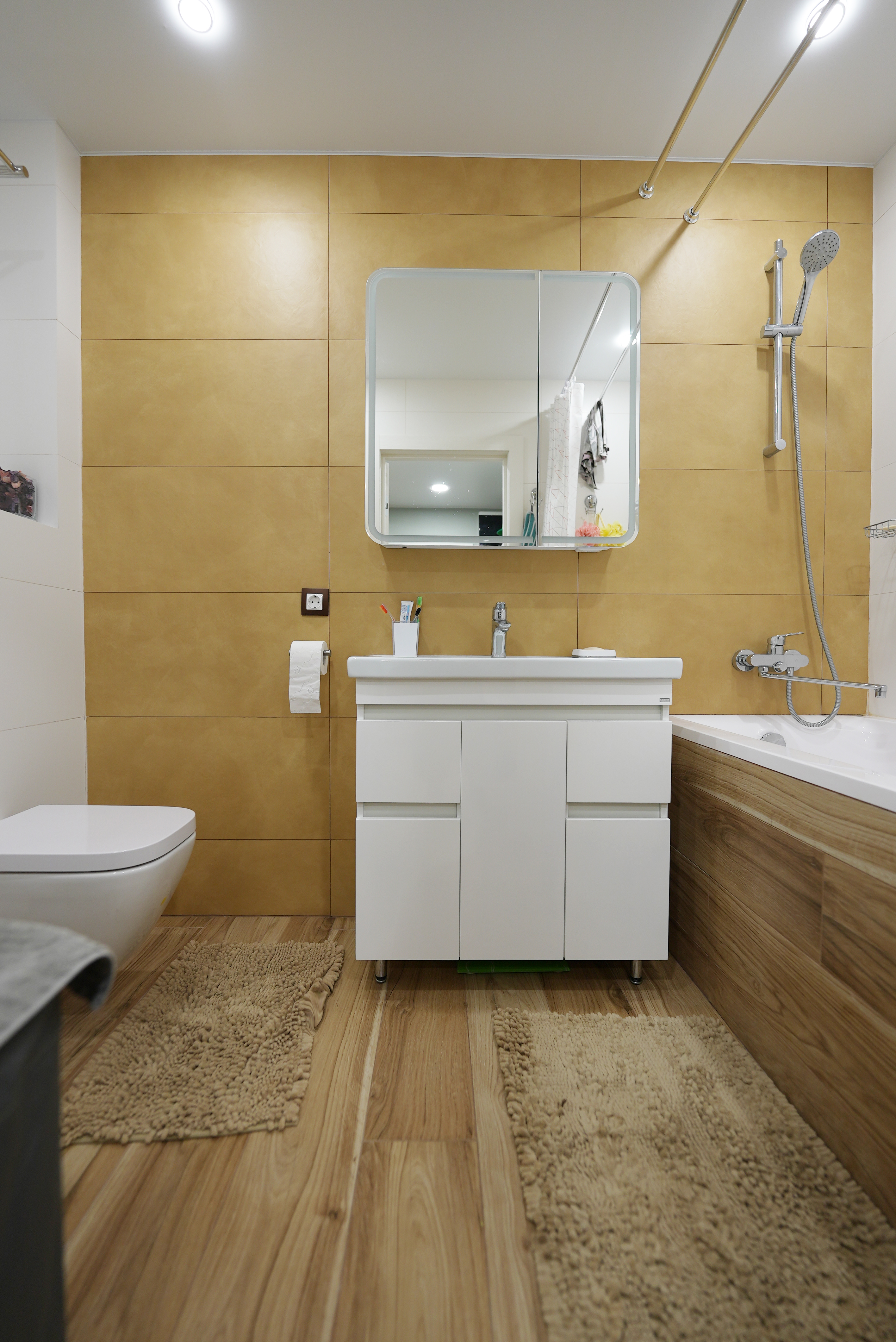 - Чистовая отделка: укладка керамогранита на пол и стены, шпаклевка стен и потолка под окраску, заливка наливного пола, укладка инженерной доски, окраска стен и потолка, установка розеток, выключателей и светильников.