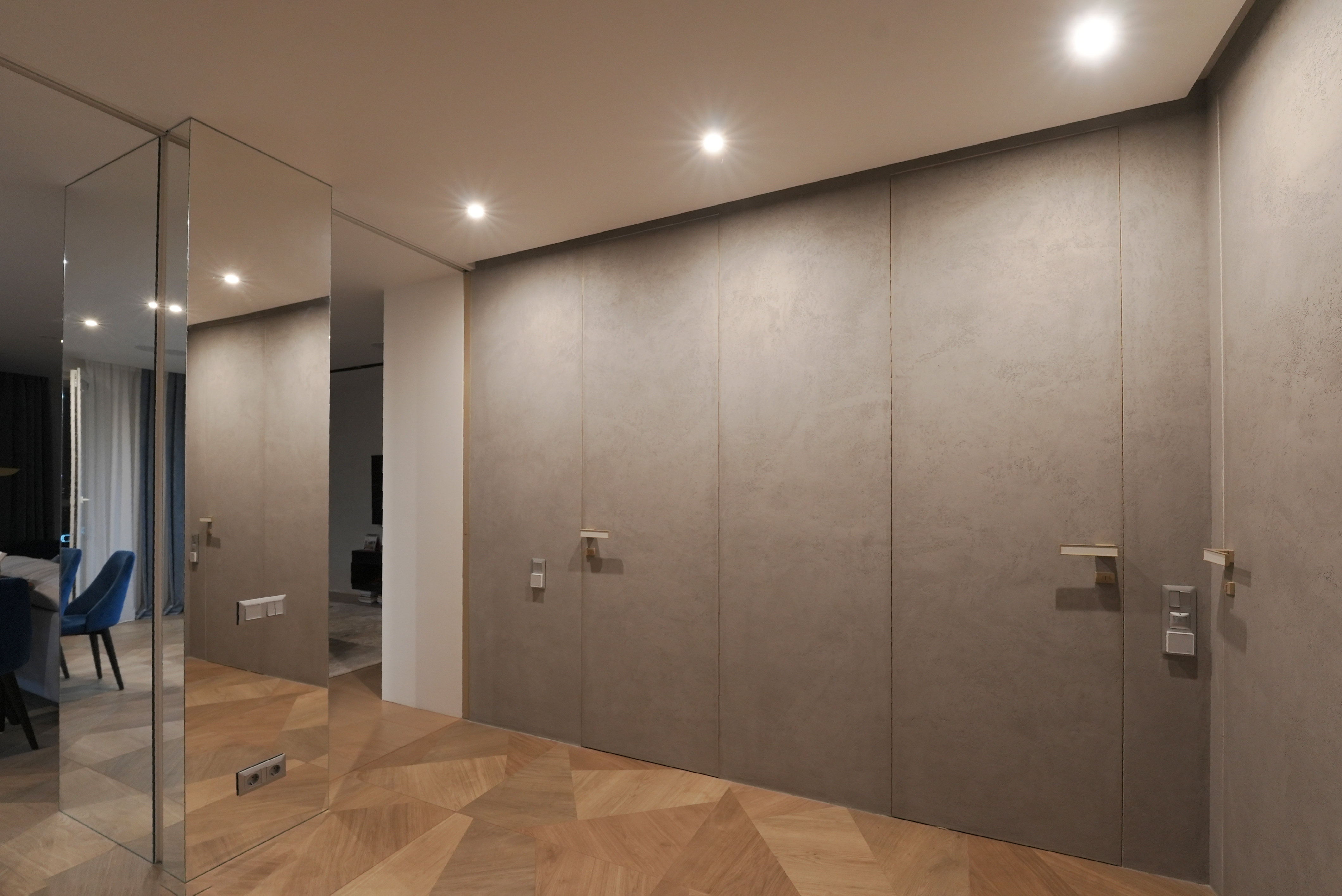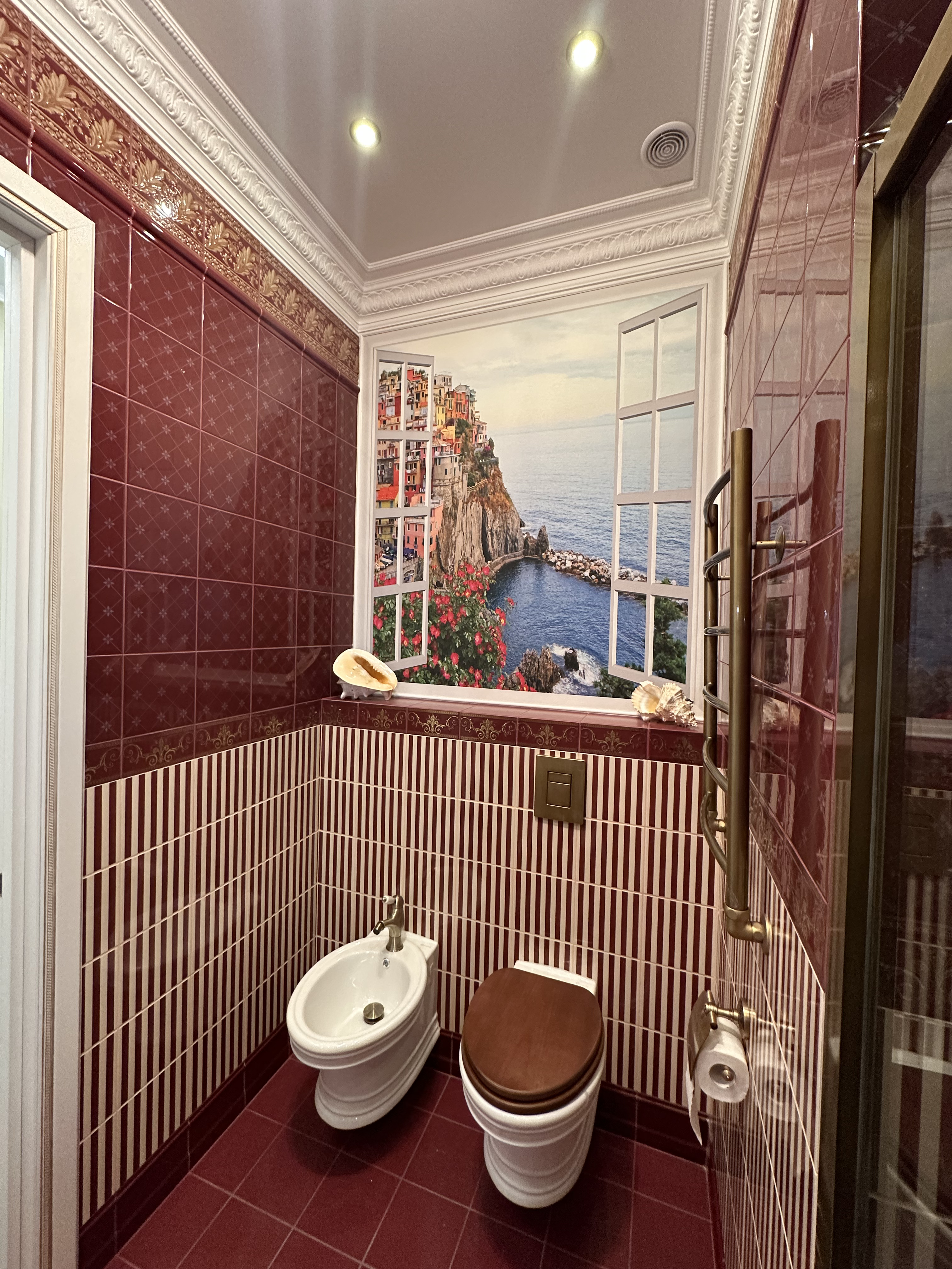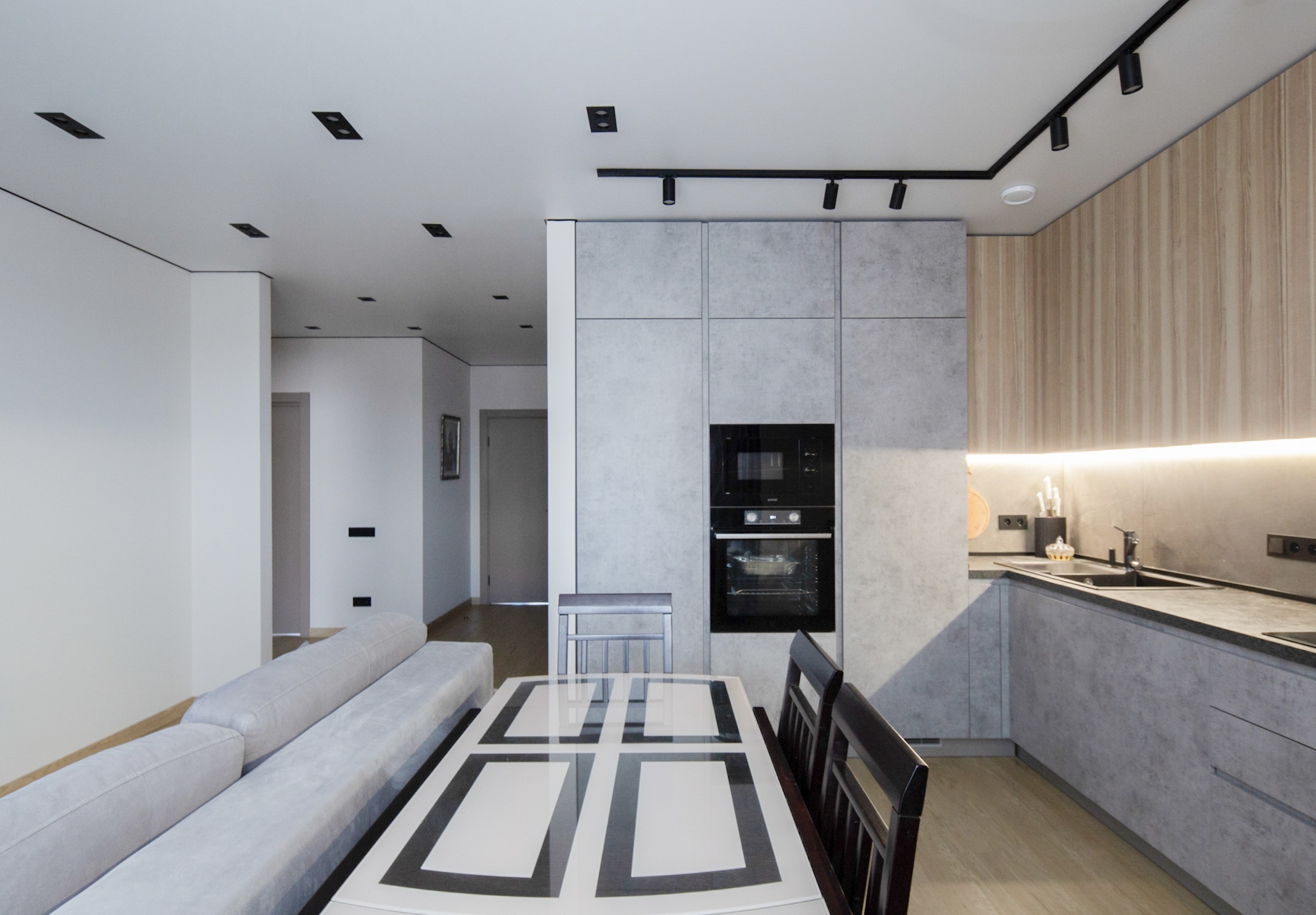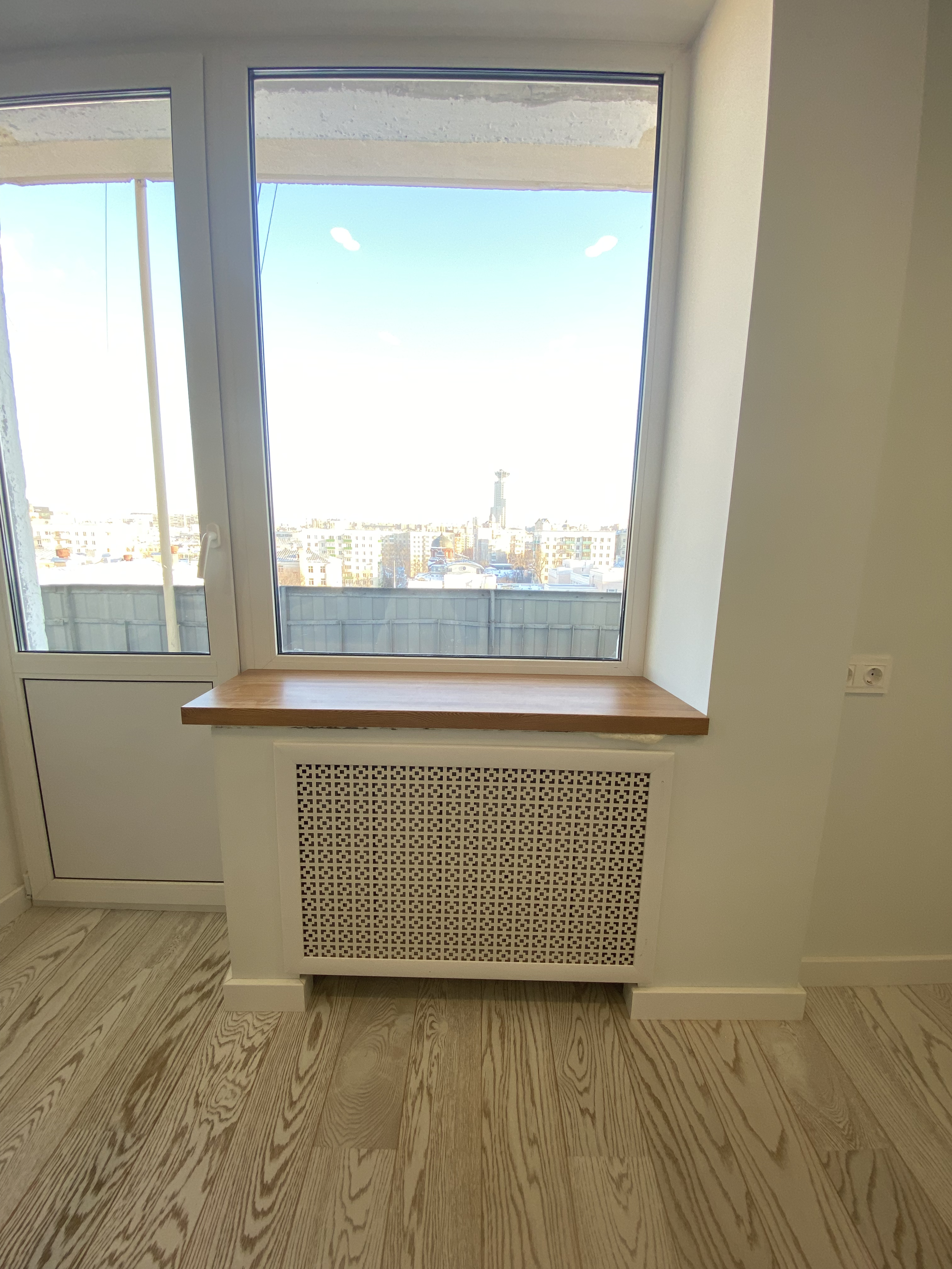 - Чистовая отделка: укладка керамогранита на пол и стены, шпаклевка стен и потолка под окраску, заливка наливного пола, укладка инженерной доски, окраска стен и потолка, установка розеток, выключателей и светильников.