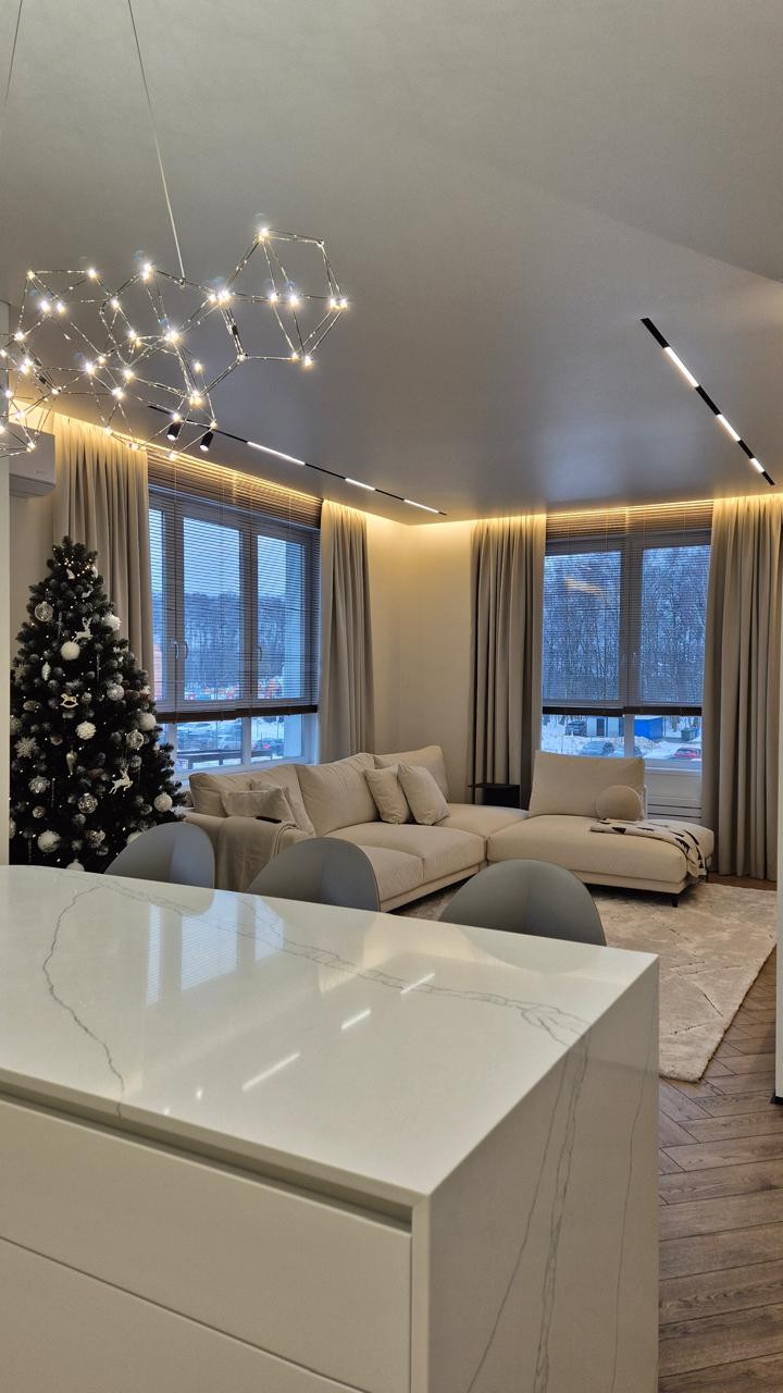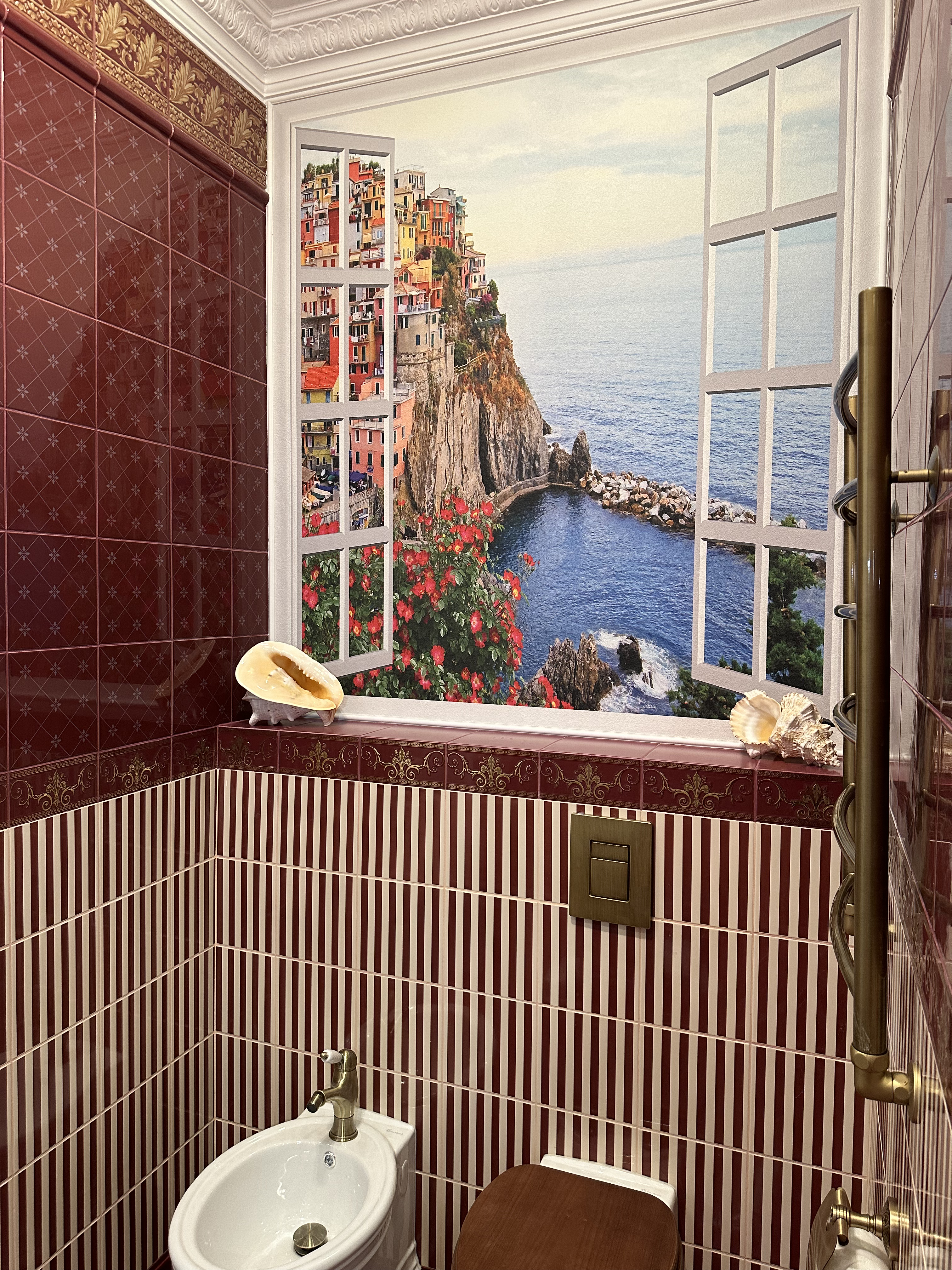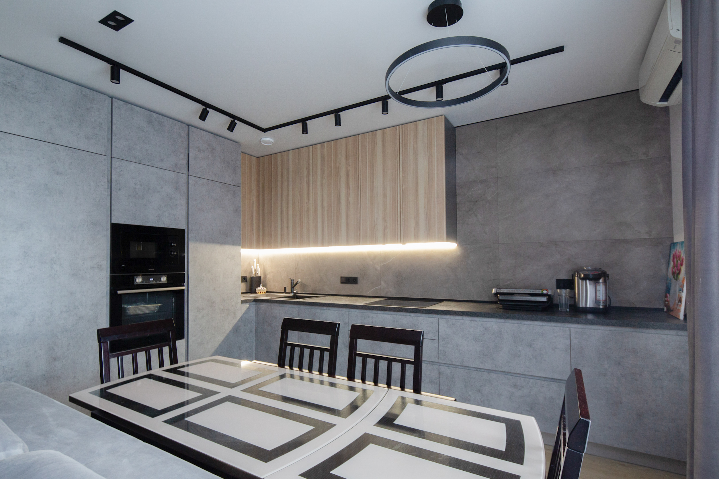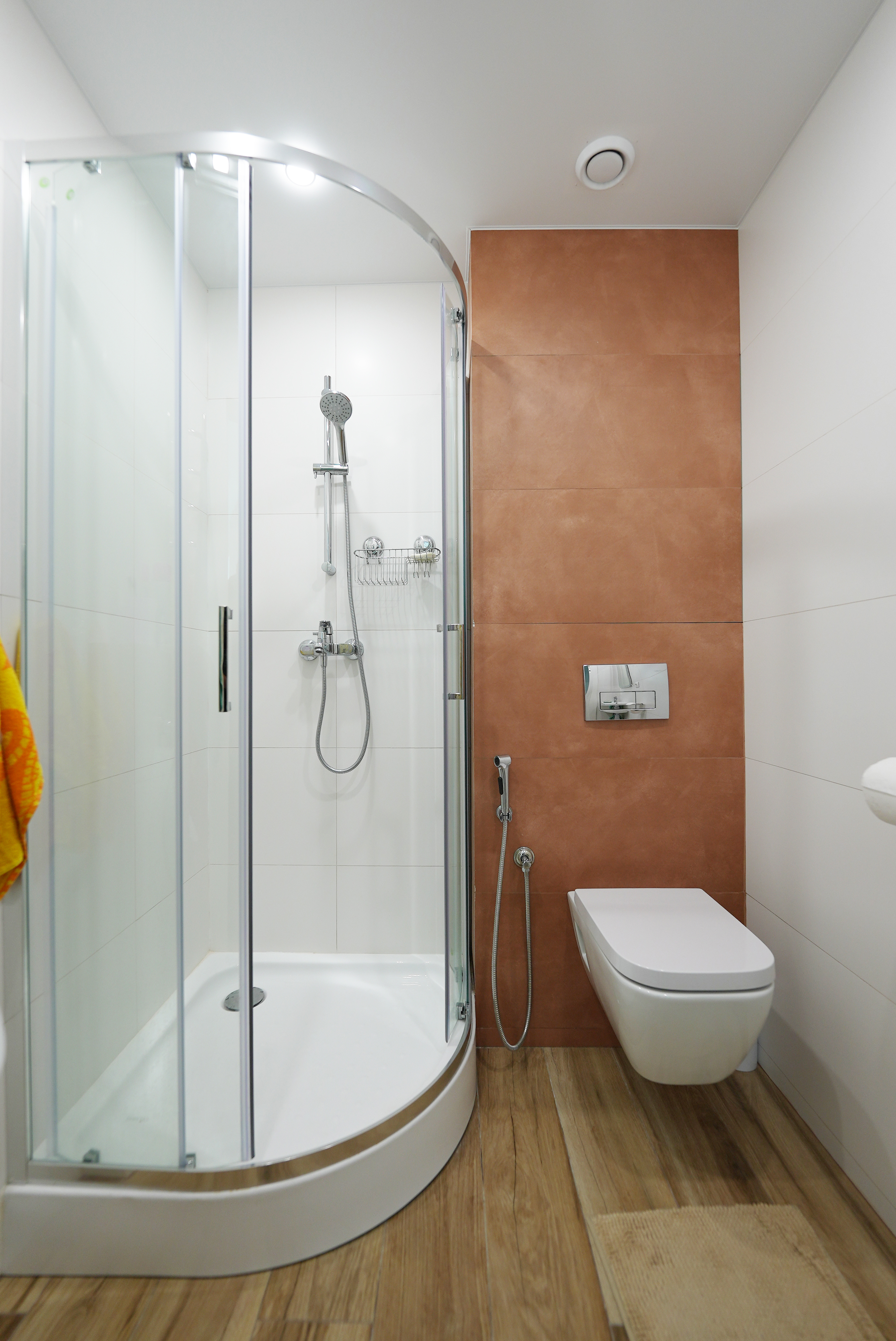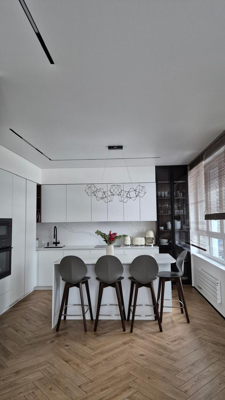 - Чистовая отделка: укладка керамогранита на пол и стены, шпаклевка стен и потолка под окраску, заливка наливного пола, укладка инженерной доски, окраска стен и потолка, установка розеток, выключателей и светильников.