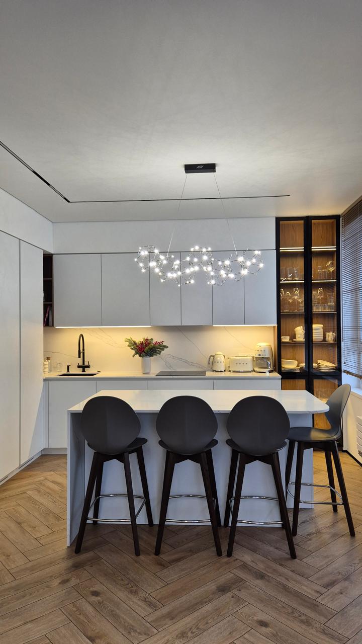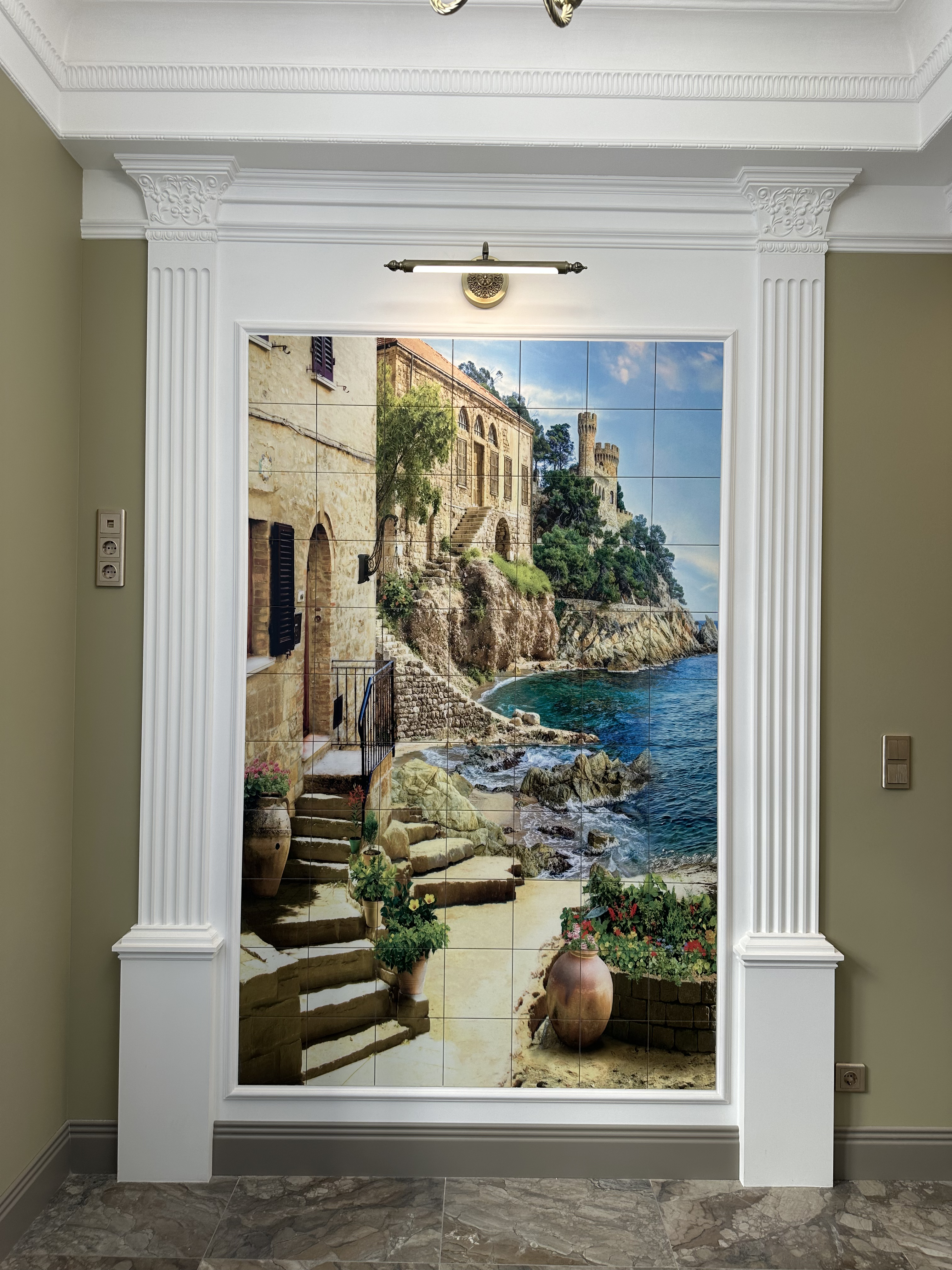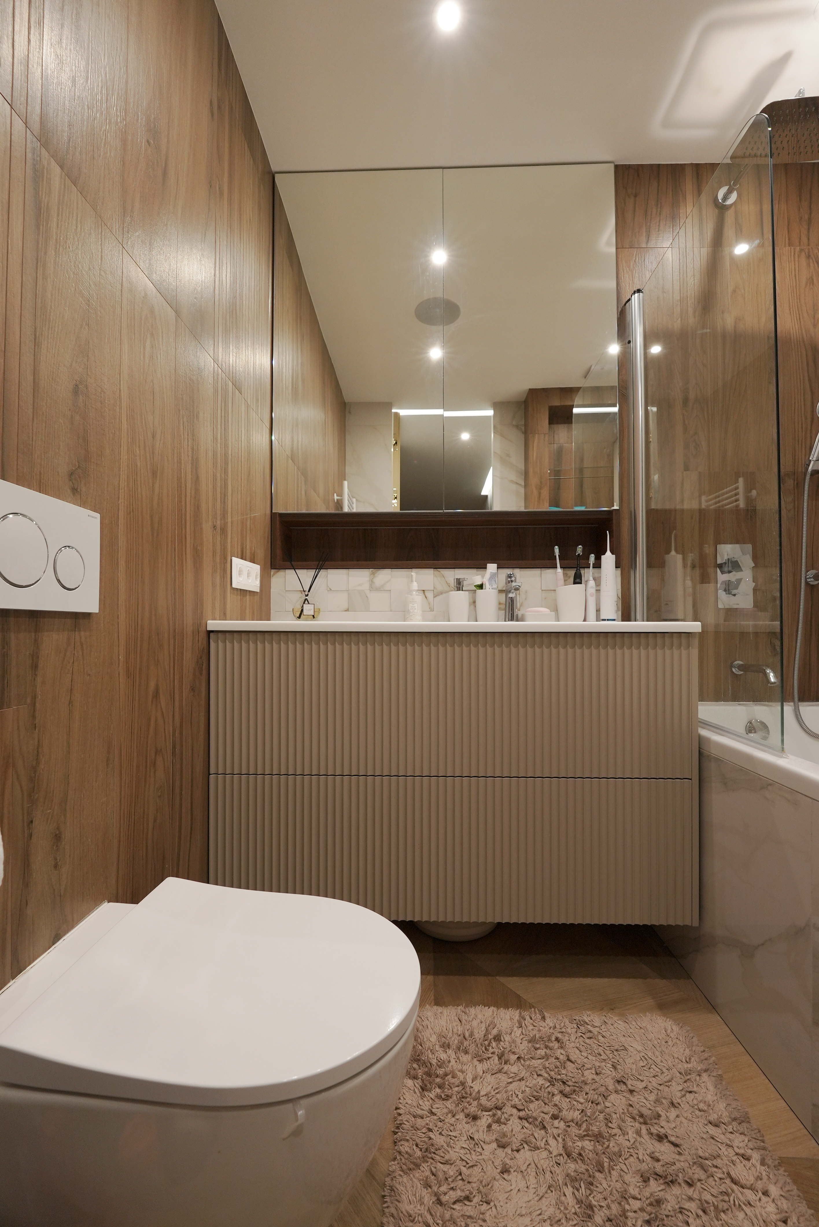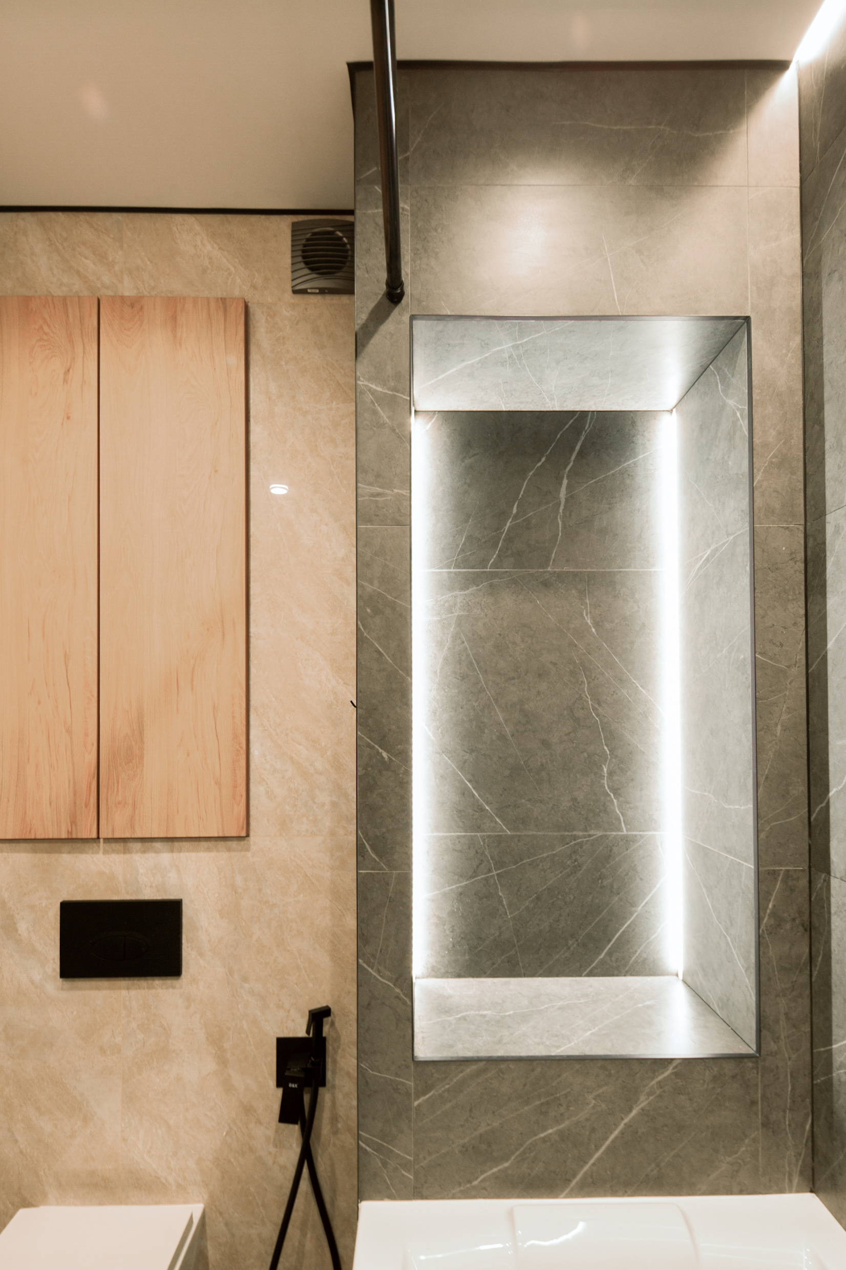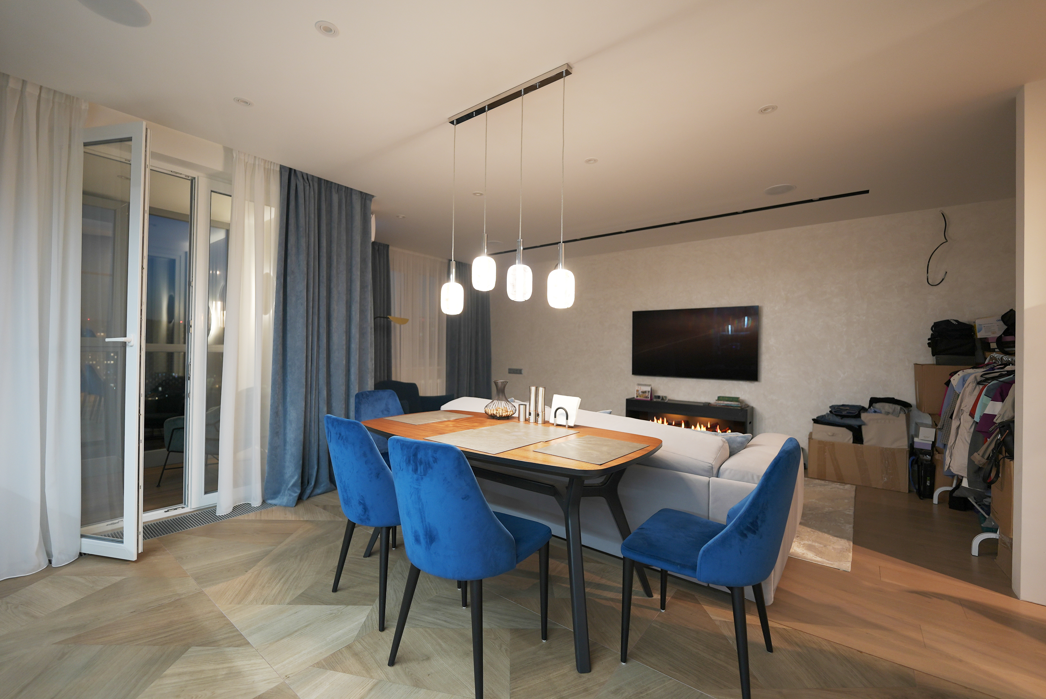 - Чистовая отделка: укладка керамогранита на пол и стены, шпаклевка стен и потолка под окраску, заливка наливного пола, укладка инженерной доски, окраска стен и потолка, установка розеток, выключателей и светильников.